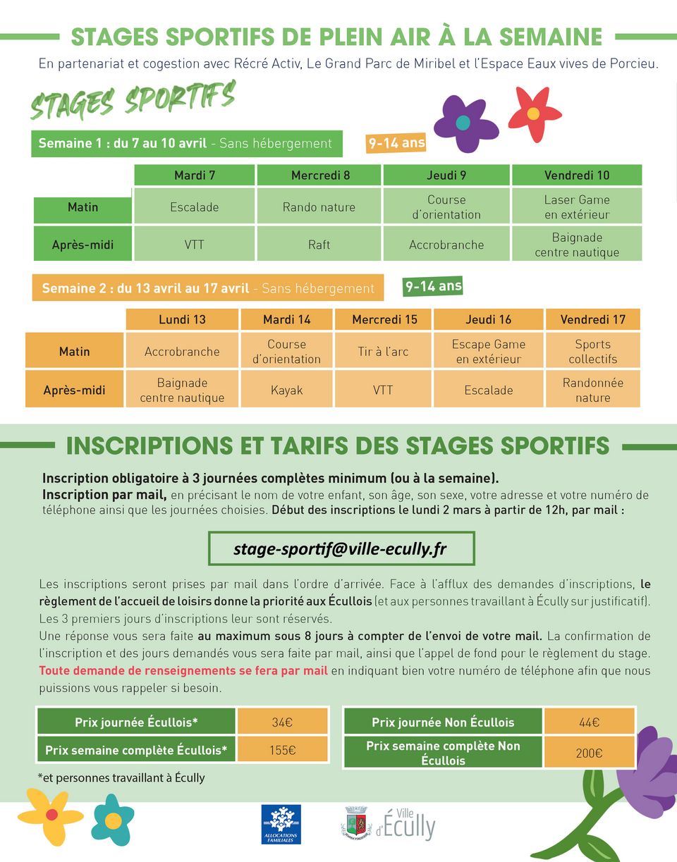 Elles se font directement par mail à stage-sportif@ville-ecully.fr à partir du 2 mars à midi et non par le Portail famille.