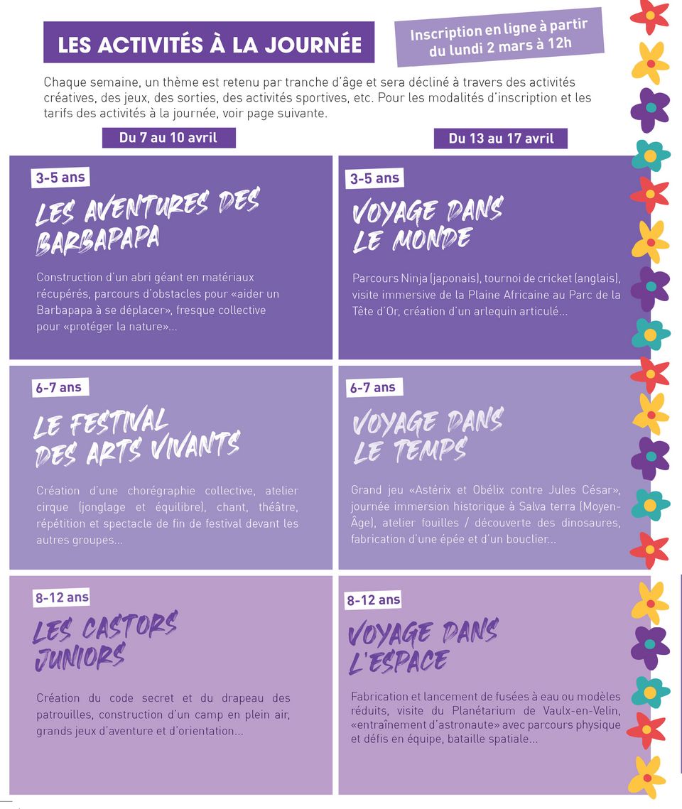 Les activités proposées par la Ville pendant les périodes de vacances scolaires s’organisent autour de 2 propositions et 3 tranches d’âge.