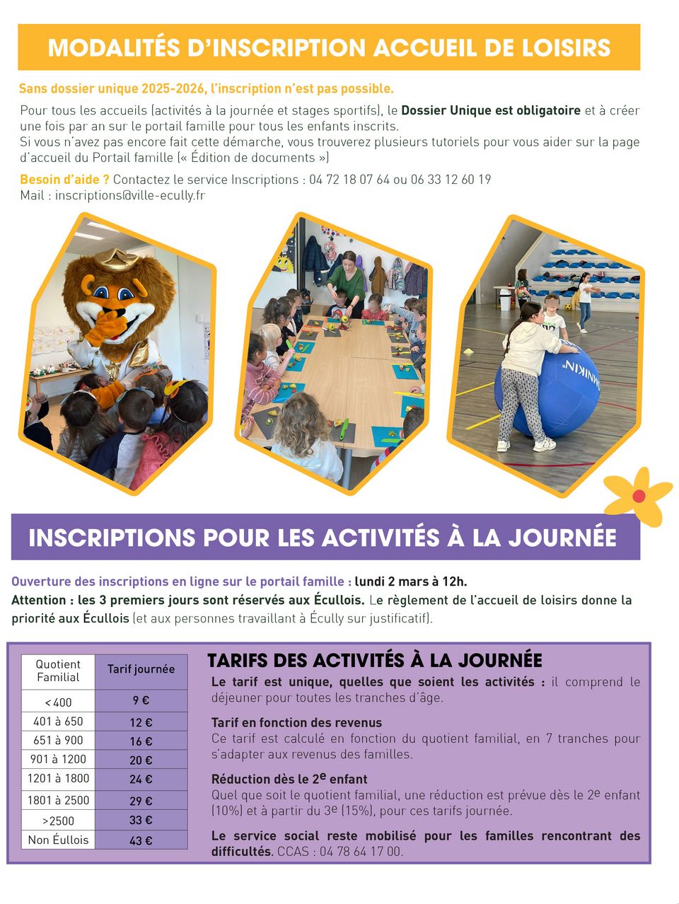A défaut, vous pouvez contacter le service inscriptions par mél uniquement à inscriptions@ville-ecully.fr en mettant en objet « RECLAMATION VACANCES Avril 2026 ».