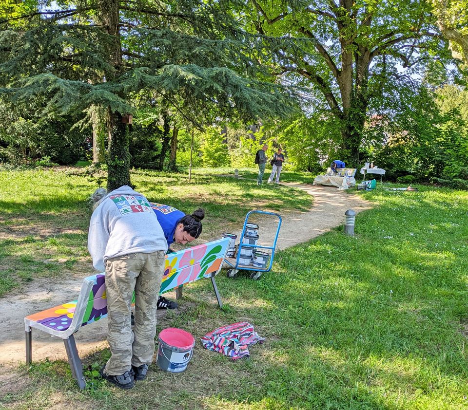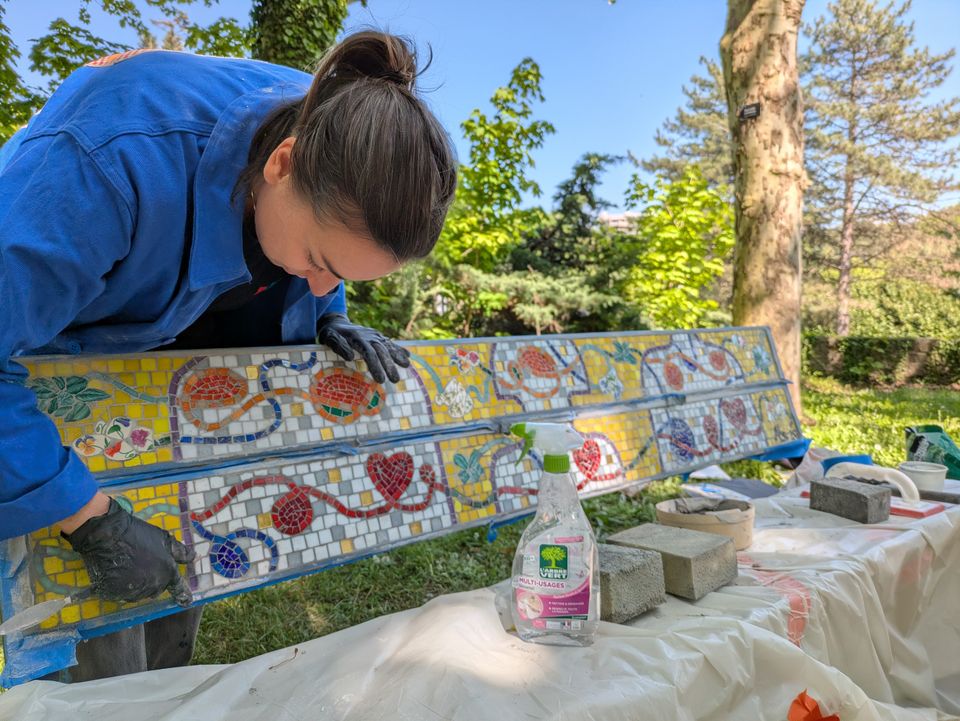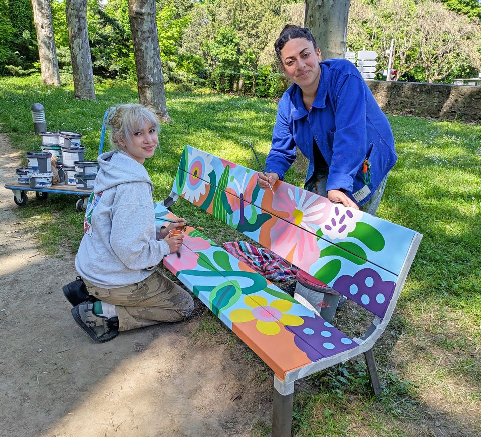 C'est Piment Martin qui, avec l’aide de Meï-Li, a attaqué dès mardi la peinture d’un premier banc aux motifs colorés, où la nature semble prendre possession du mobilier grâce à des motifs à une échelle amplifiée de fleurs et de papillons. Jeudi 23 avril, elle finissait ce décor luxuriant avant de terminer par une vitrification en fin de semaine.