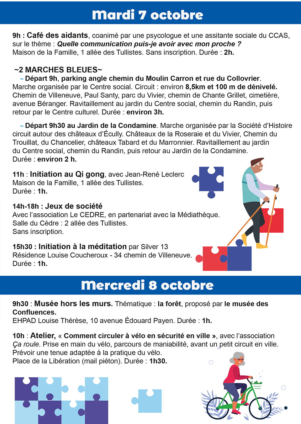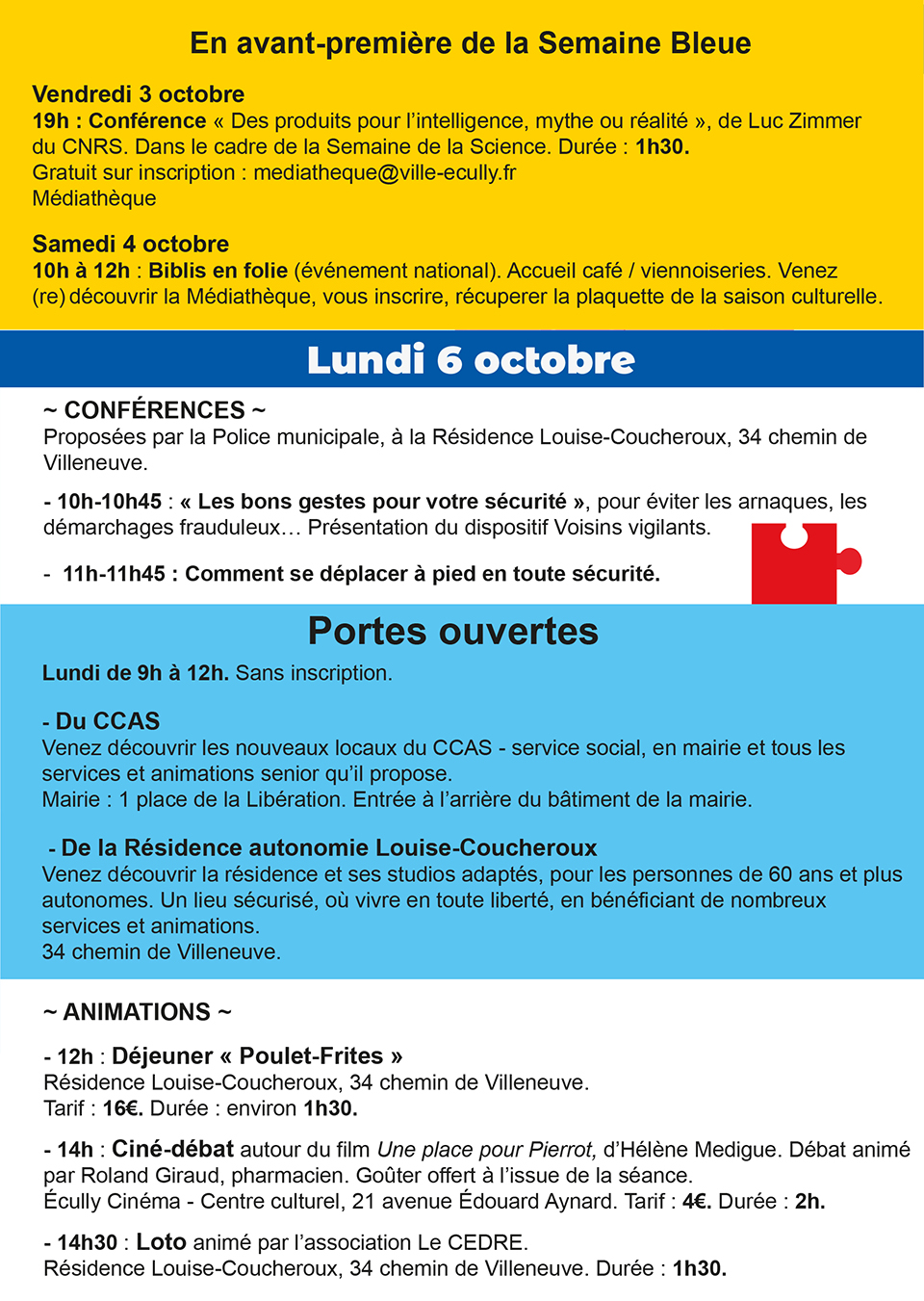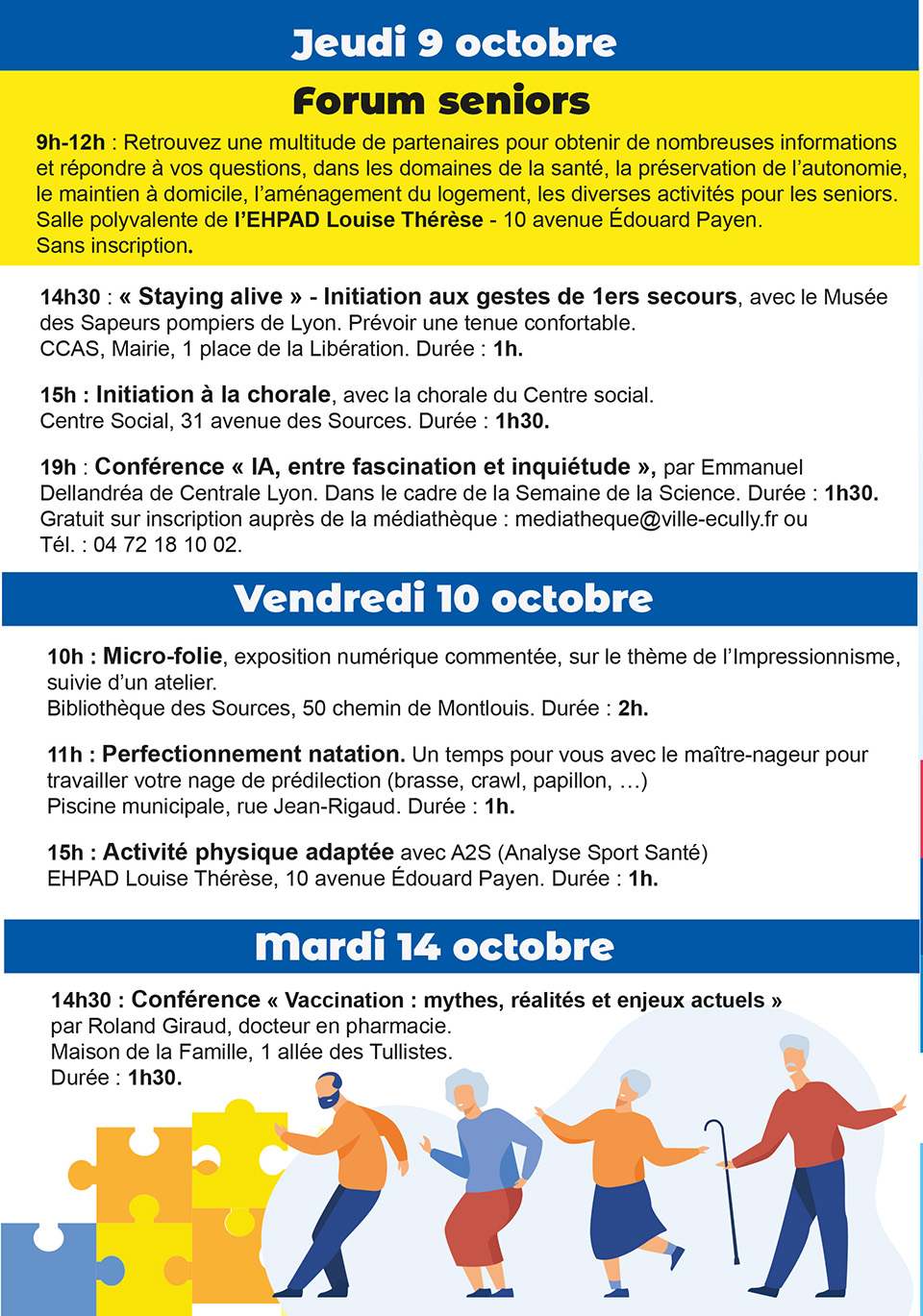La plupart des activités sont sur inscription auprès du CCAS, Tél. : 04 78 64 17 00 ou secr.ccas@ville-ecully.fr. Détail du programme sur ecully.fr.