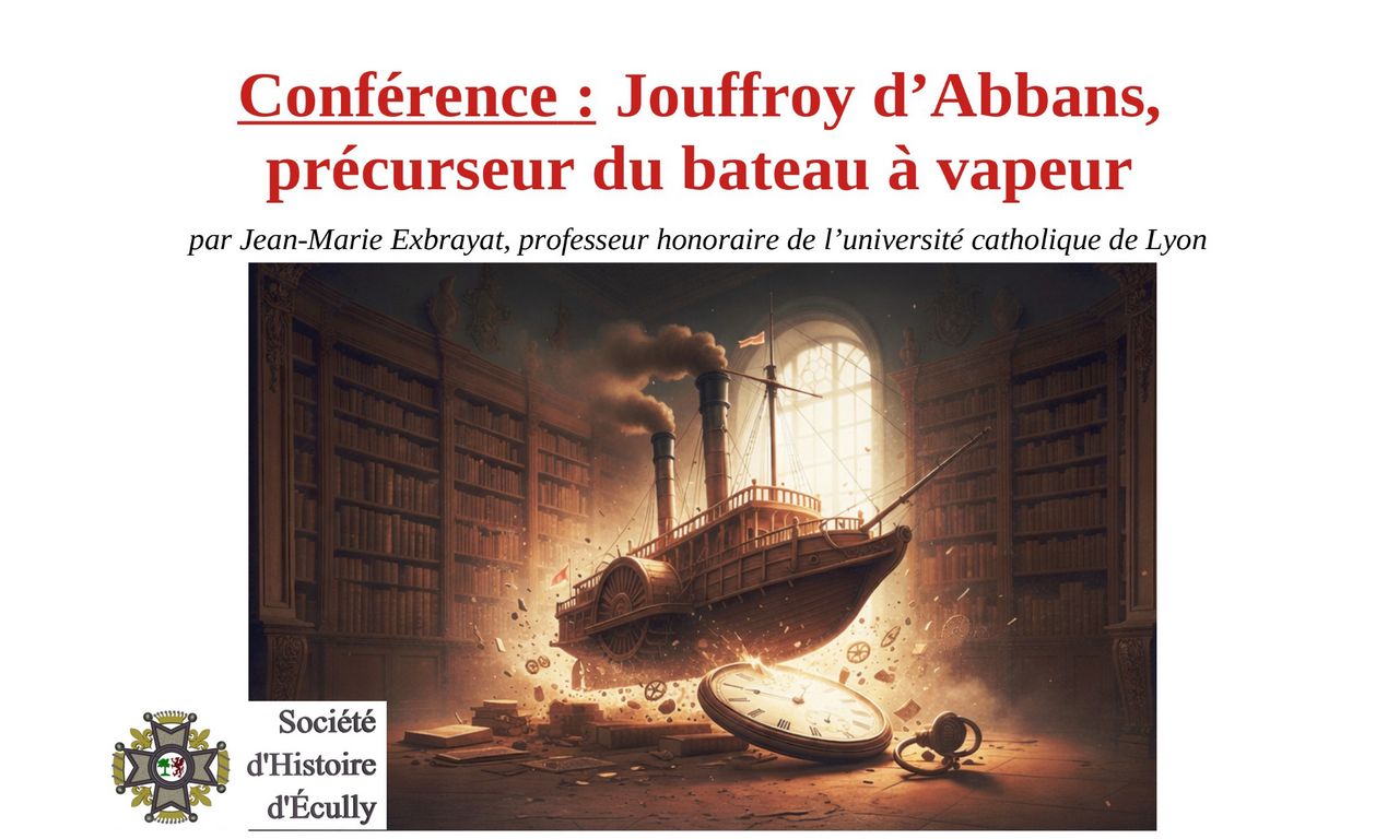 La Société d'Histoire vous propose une conférence sur Claude François de Jouffroy d'Abbans (1751-1832), pionnier écullois de la machine à vapeur dans le domaine maritime, par Jean-Marie Exbrayat, professeur honoraire de l’université catholique de Lyon.