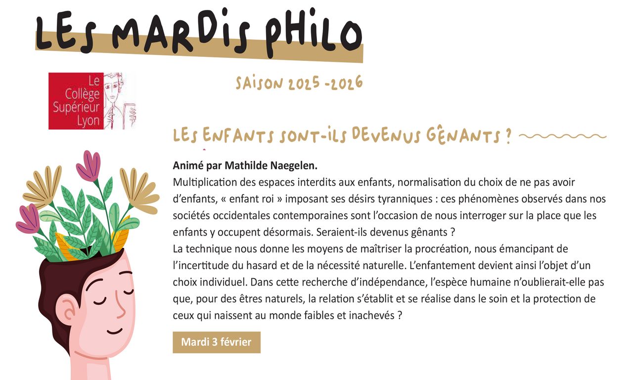 Le prochain Mardi philo aura pour thème : « Les enfants sont-ils devenus gênants ».