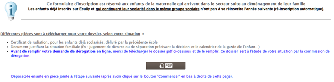 Toute dérogation à la carte scolaire est exceptionnelle et soumise à l’examen d’une commission. Dans ce cas, sur votre espace famille, remplir le formulaire « Demande de dérogation maternelle ou élémentaire ». Avant de remplir en ligne votre formulaire de demande de dérogation, vous aurez à télécharger le dossier à remplir pour la commission en cliquant sur le bouton PDF de la première page de votre démarche :
