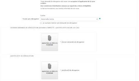 2) joindre le dossier rempli pour la commission, avec la pièce justificative, dans le formulaire de saisie de votre demande d’inscription scolaire avec dérogation, accessible après avoir cliqué sur le bouton « Commencer » en bas à droite de la page où vous avez téléchargé le dossier à remplir pour la commission